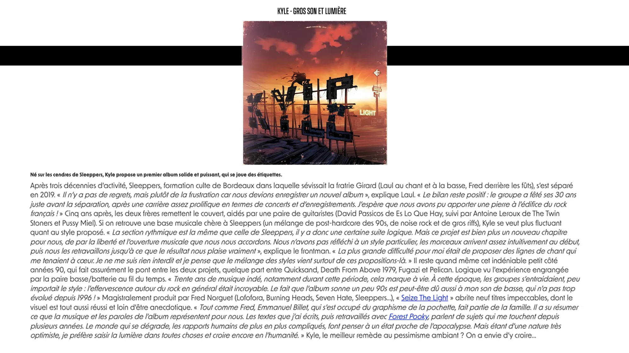 Né sur les cendres de Sleeppers, formation culte de Bordeaux dans laquelle sévissait la fratrie Girard (Laul au chant et à la basse, Fred derrière les fûts) jusqu'en 2019, rejoint dans l'aventure par David Passicos et Denis Cornardeau aux guitares, Kyle se fend d’un premier album solide et puissant, dans lequel la valse des étiquettes semble être le mot d’ordre.